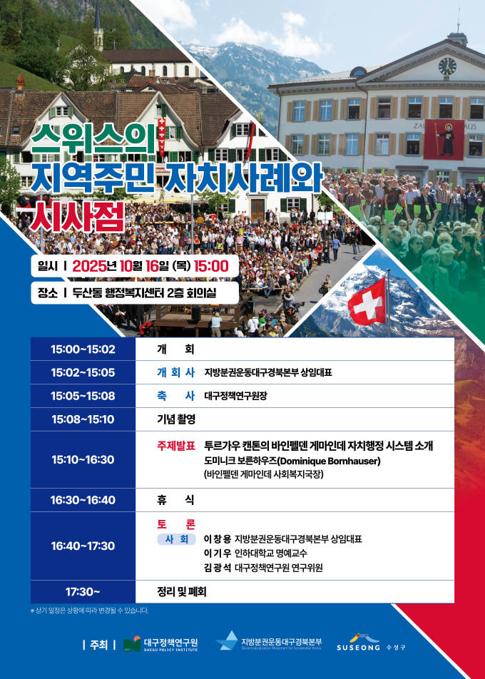 이창용 상임대표는 이날 행사의 의미에 대해 "스위스처럼 주민이 예산과 정책을 직접 결정할 수 있는 구조로 발전해야 진정한 분권이 가능하다"면서 "대구 또한 생활밀착형 주민자치를 강화해 '참여 중심의 지역정부'로 나아가야 한다"고 주장했다. 아울러 "스위스의 실질적 주민자치 운영 경험을 공유하고 대구형 '시민참여형 지방자치 모델'을 구축하기 위한 실천적 계기됐다"고 말했다.