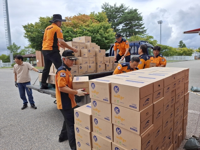 지난 9월 강원도 강릉시 강북공설운동장에 한국수자원공사의 병입 수돗물이 지원되고 있는 모습. 한국수자원공사는 재난 지역으로 선포된 강릉시 가뭄 피해 지역에 약 4만 5천 병의 병입 수돗물을 지원했다.