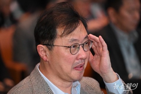 (앞 줄 오른쪽 세 번째)최태원 SK그룹 회장과 (앞 줄 왼쪽 두 번째)최재원 수석부회장이 3일 오전 서울 강남구 코엑스에서 열린 'SK AI 서밋 2025'에서 박수를 치고 있다.