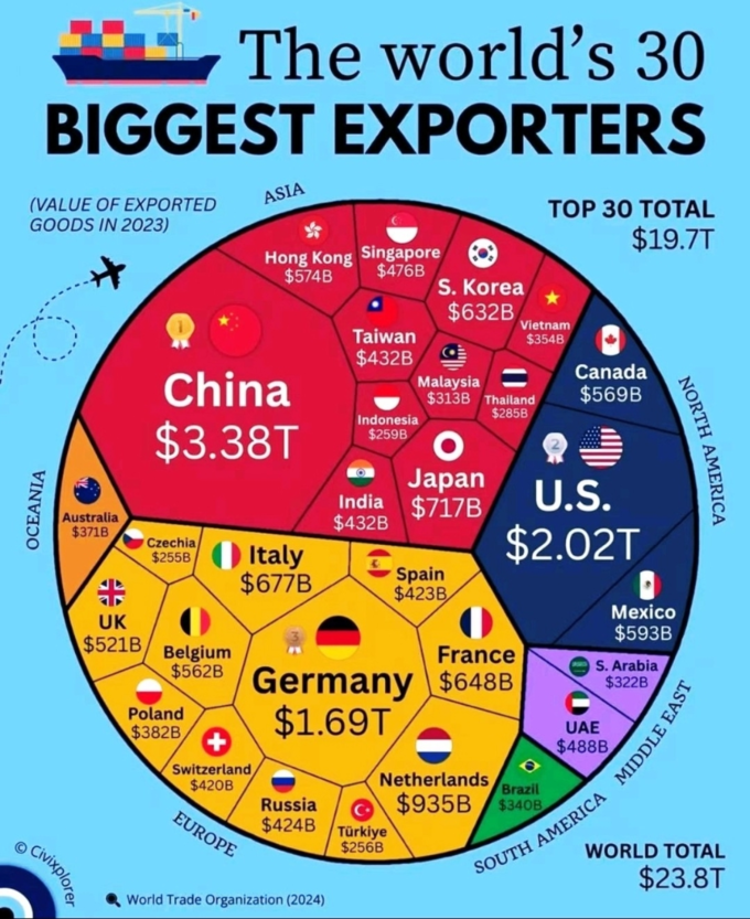 2023년 기준 우리나라는 6,837억 달러의 상품을 수출하며 세계 6위를 기록했다.