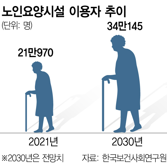 19일 한국보건사회연구원에 따르면 노인요양시설 이용자 수는 2021년 21만 970명에서 2030년 34만 145명으로 9년 새 60% 넘게 늘어날 것으로 전망됐다. 반면 시설 공급의 대폭 확충이 이뤄지지 않을 경우 2030년 14만 8000여 명의 노인 인구가 요양시설 부족으로 돌봄 공백을 겪을 것으로 추정됐다.