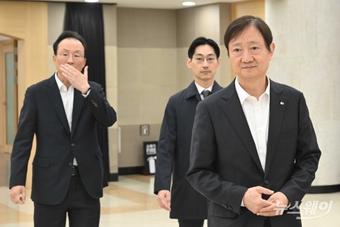 (중앙)이찬진 금융감독원장과 조용병 전국은행연합회장을 비롯한 내빈들이 14일 오전 서울 여의도 국민은행 본점에서 열린 오픈뱅킹 안심차단서비스 출시 간담회에서 기념촬영을 마친 뒤 자리로 향하고 있다.