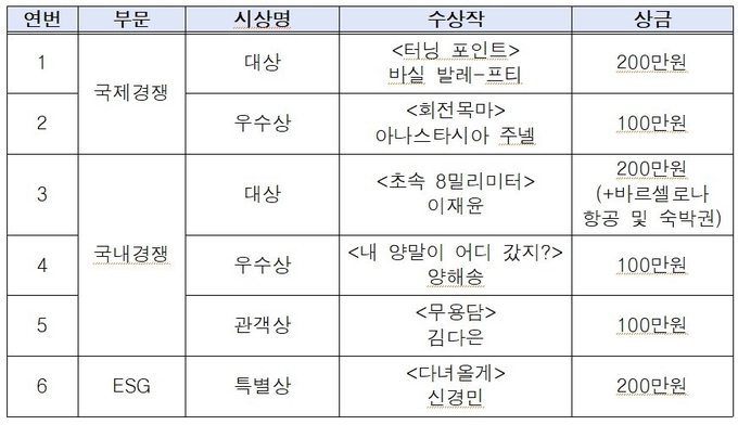 이날 시상식에서는 국제 및 국내 경쟁 부문 대상을 포함한 총 6개의 수상작이 발표됐다. 국제 경쟁 부문 대상은 바실 발레-프티 감독의 <터닝 포인트>, 국내 경쟁 부문 대상은 이재윤 감독의 <초속 8밀리미터>가 각각 수상했다. 또한 국제 경쟁 부문 우수상은 아나스타시아 주넬 감독의 <회전목마>, 국내 경쟁 부문 우수상은 양해송 감독의 <내 양말이 어디 갔지?>, 관객상은 김다은 감독의 <무용담>이 선정되었으며, ESG 특별경쟁 부문에서는 신경민 감독의 <다녀올게>가 ESG 특별상을 수상했다.