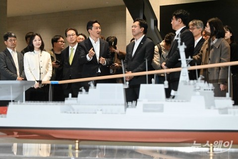 (앞 줄 왼쪽 여섯 번째)정기선 HD현대 회장이 20일 오후 경기 성남시 HD현대글로벌R&D센터에서 열린 조선해양 산업 AI 업무 협약식에 참석하기 앞서 전시 부스를 찾아 (일곱 번째)배경훈 부총리 겸 과학기술정보통신부 장관에게 'CES Mock-up zone'을 설명하고 있다.