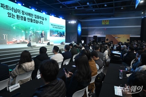김범석 우아한형제들 최고경영자가 8일 오전 서울 서초구 aT센터에서 열린 2025 배민파트너페스타에서 '배달의민족이 변하고 있는 이유'를 주제로 발표하고 있다.