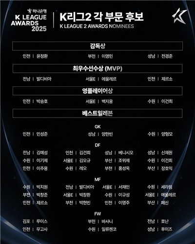 이날 발표된 후보들은 오는 24일부터 구단 감독(30%), 주장(30%), 미디어(40%) 투표를 통해 최종 수상자가 결정된다. 베스트11 명단은 시상식 당일인 내달 1일 오전 공개될 예정이며, MVP·영플레이어·감독상 등의 주요 개인상은 같은 날 오후 3시 서울 홍은동 스위스그랜드호텔에서 열리는 '하나은행 K리그 2025 대상 시상식'에서 발표된다.