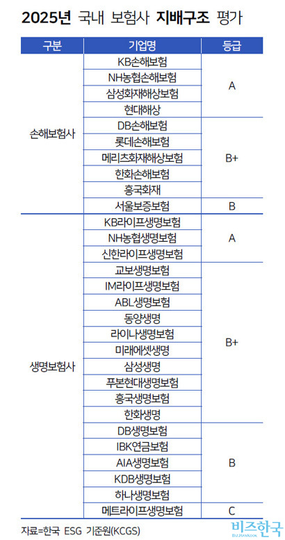 [비즈한국] 연말을 맞아 기업의 ESG 경영 활동이 활발한 가운데 올 한 해 기업의 ESG 성과에 눈길이 쏠린다. 국내외 ESG 관련 기관들은 최근 2025년 평가 결과를 공표했다. 금융권의 지배구조 평가 결과 금융지주·은행·카드사와 금융투자업체·보험사·여신전문금융사 사이 양극화 현상이 두드러진 가운데, 국내 주요 보험사의 2025년 지배구조 평가 결과를 살폈다.