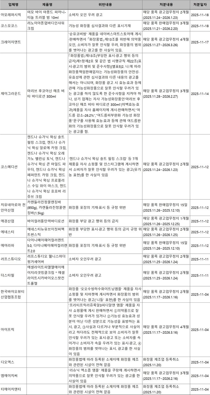 11월 11일에는 러프스튜디오와 더스타힐이 소비자 오인우려 광고로 각각 해당 품목 광고업무정지 2개월(11월 25일~2026년 1월 24일)의 행정처분 대상이 됐다.