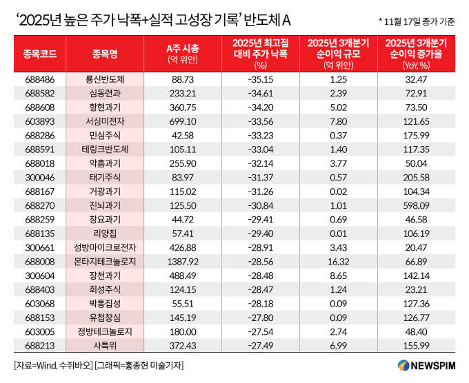 중국 관영 증권시보(證券時報) 산하의 데이터 산출 플랫폼 수쥐바오(數據寶)에 따르면, 2025년 11월 17일 종가 기준 선완증권(申萬證券)이 산출한 반도체 지수는 연초 대비 40.63% 상승해 같은 기간 상하이종합지수의 상승률을 크게 앞질렀다.