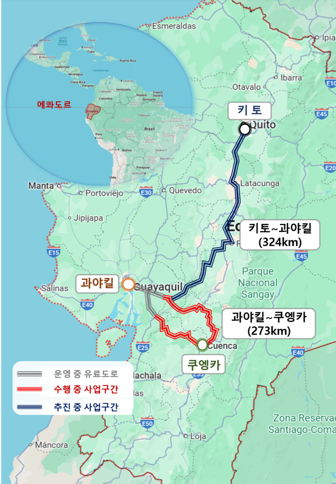 최근 한국도로공사는 에콰도르 과야킬∼쿠엥카 도로개량 사전타당성 조사 사업(’24.11∼’25.10, 11개월)을 성공적으로 수행해 기술력을 인정받았고, 이에 키토∼과야킬 도로개량 사전타당성 조사 추진에 합의한 것으로, 공사는 해당 노선의 개량을 위한 기술적 조사와 경제성 분석 등을 진행할 계획이다.