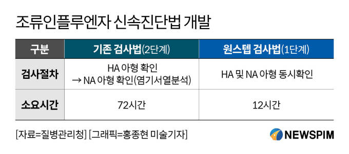 질병청의 진단검사법 개발로 AI가 실제 발생하게 되면 인체감염 진단은 72시간에서 12시간으로 단축된다. 지금의 AI 인체감염증 검사는 2단계다. 지역 보건환경연구원 또는 질병대응센터는 A형 또는 HA 아형을 확인하기 위해 유전자 검출 검사를 실시한다. 이후 질병청에서 염기서열분석을 통해 NA 아형을 구분하는 작업을 거친다.