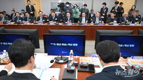 (오른쪽 두 번째)손재일 한화에어로스페이스 대표이사가 15일 오전 서울 여의도 국회의원회관에서 열린 '25-1차 K-방산 리더스 조찬 포럼'에서 발언을 하고 있다.