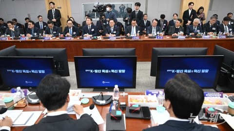 (오른쪽 두 번째)이용배 현대로템 사장이 15일 오전 서울 여의도 국회의원회관에서 열린 '25-1차 K-방산 리더스 조찬 포럼'에서 발언을 하고 있다.