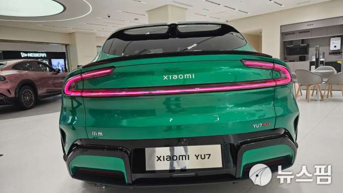 18일 옌타이시 즈푸구 '허마셴성' 상가 건물안의 샤오미 매장 책임자는 최신형 샤오미의 SUV 전기차 모델 YU7을 가리키며 판매 가격이 한화 7000만원이 넘는다고 소개했다.