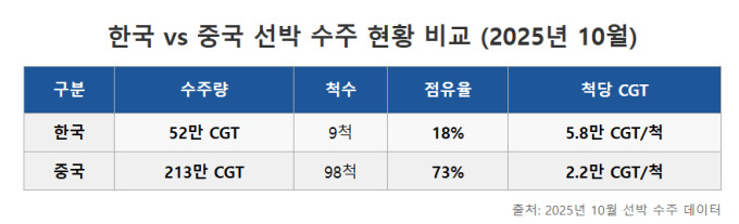 물량만 보면 중국이 213만CGT(98척, 73%)로 압도적이고 한국은 52만CGT(9척, 18%)다. 그러나 척당 환산톤수는 한국 5.8만CGT로 중국 2.2만CGT의 약 2.6배에 달한다.