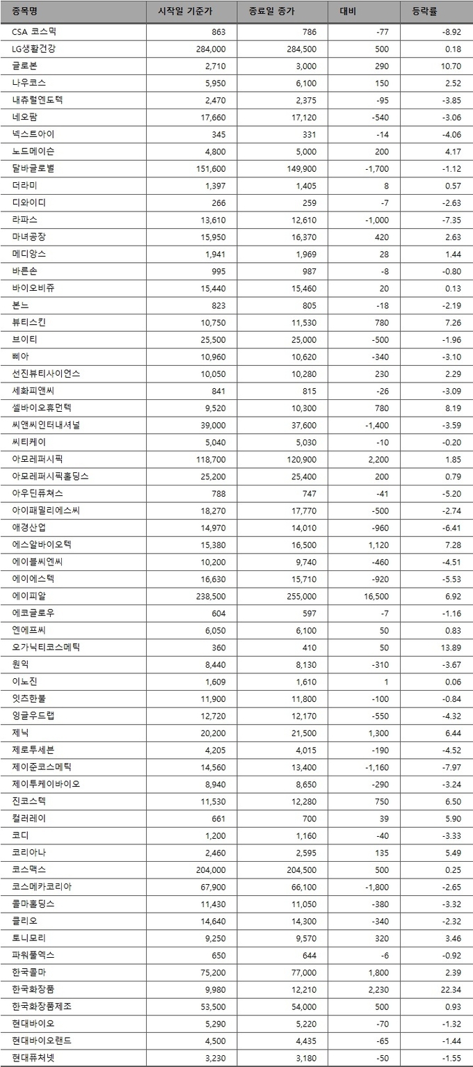 반면 CSA 코스믹(-8.92%), 제이준코스메틱(-7.97%), 라파스(-7.35%), 애경산업(-6.41%), 에이에스텍(-5.53%), 아우딘퓨쳐스(-5.20%)는 약세를 나타냈다.